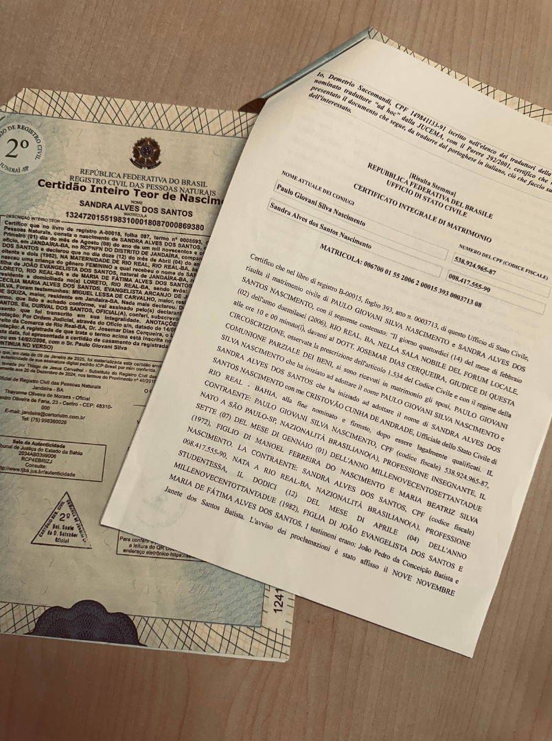 We offer a complete translation service for all types of documents from Portuguese, Spanish, and English into Italian, essential for citizenship, residency, civil registry, and other procedures with Italian consulates or authorities in Italy.